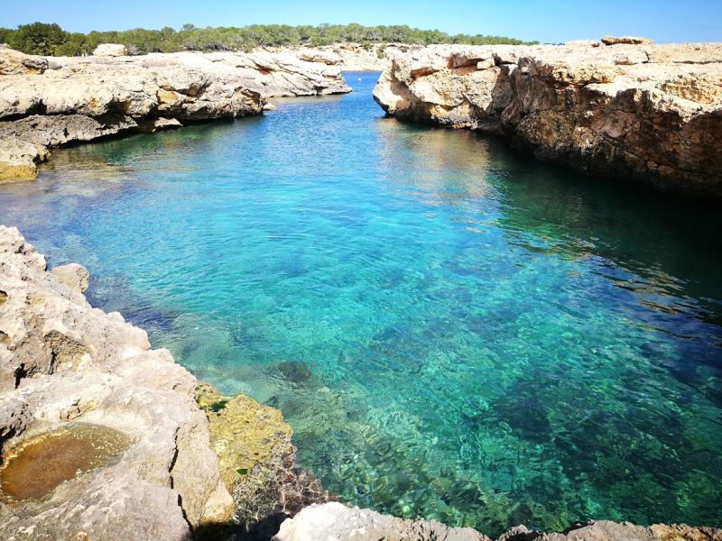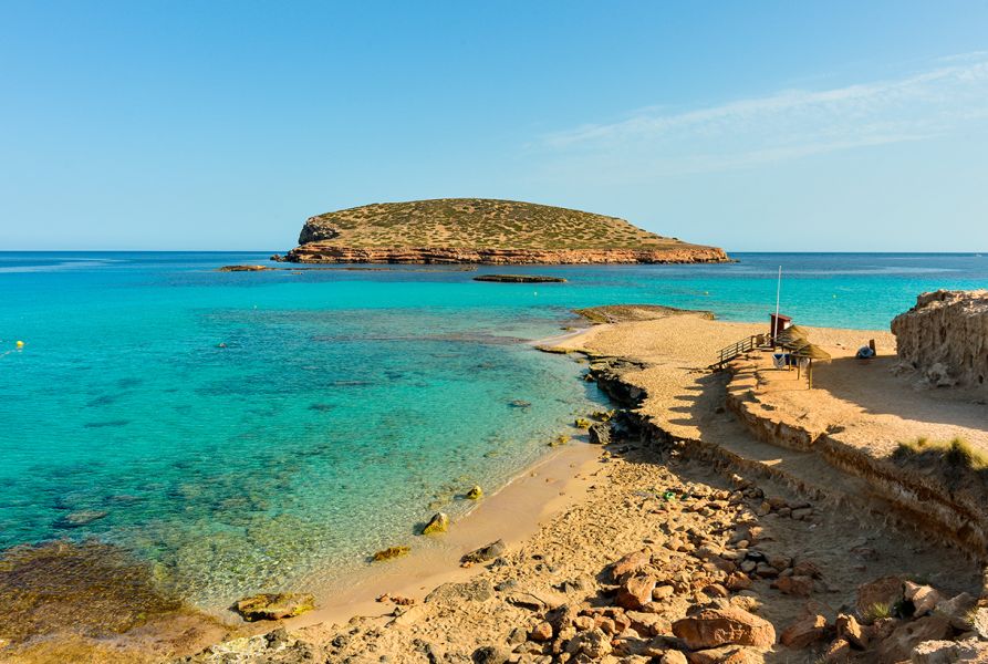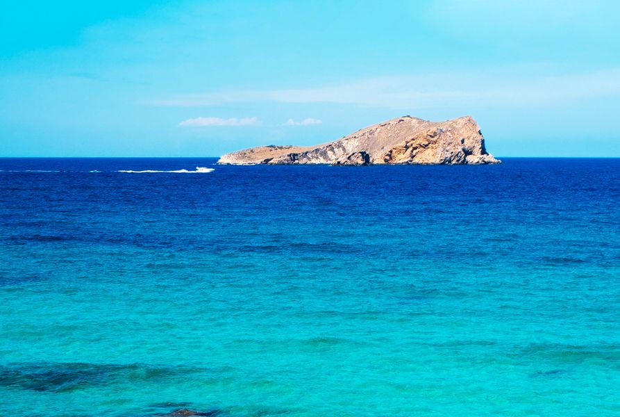 Prácticamente único en las costas de Ibiza y a medida que nos acercamos a la costa la intensidad del azul disminuye, hasta adquirir un mar de tonalidades azules turquesas de finas arenas áureas donde el navegante podrá fondear tranquilamente en este idílico paraíso mediterráneo.